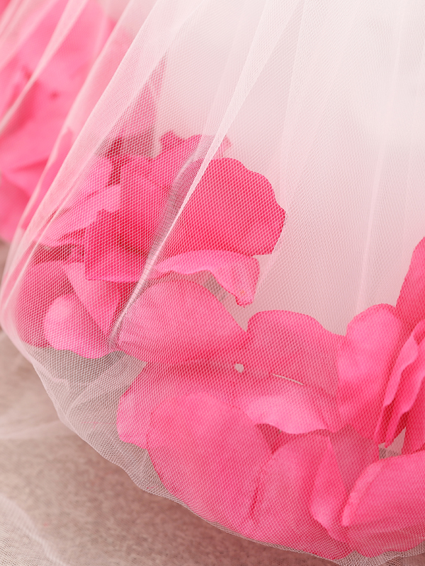 - The tutu dress has a white bodice and a tutu dress with flower petals in the hem, a belt at the waistline with flower applique